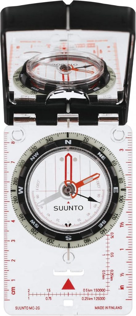 - Direction – a compass is the most ideal equipment. Phone or watch based compasses may be useful but must be carefully calibrated as they are notoriously unreliable – when they are used a gross error check must be performed. Bearing data is vital so a traditional compass should be used whenever possible, preferably with a mirror so it can be used a sighting compass.