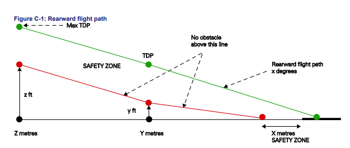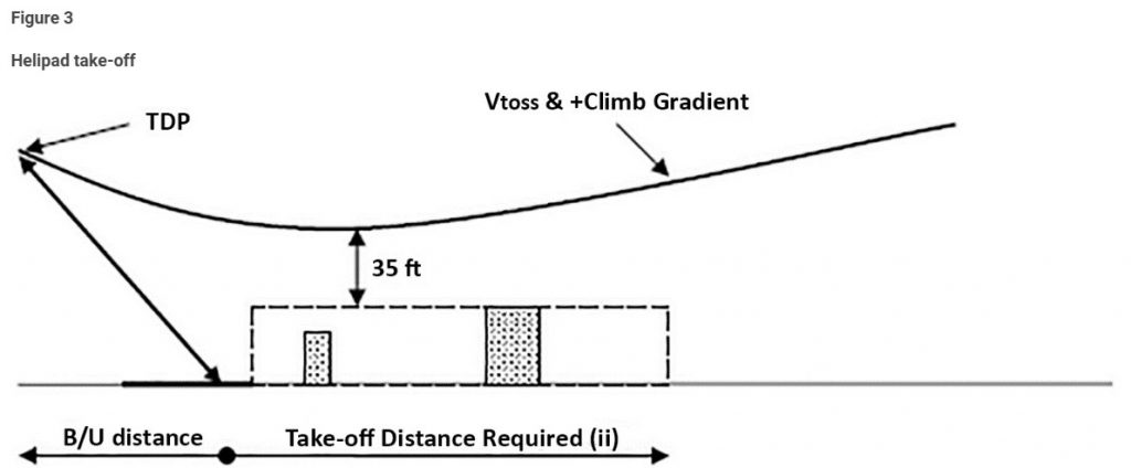 For the departure, the helipad surveyor needs to consider the case of a helicopter which has lost its engine at TDP and is continuing with the departure. The take off path includes an acceleration phase using emergency power (eg 30 sec rating) where height dips as speed is gained followed by an initial climb at VTOSS at contingency power (eg 2.5 min rating or 2 min rating), followed by a climb at Maximum Continuous Power (MCP) from 200 ft or when the contingency power times out. For this entire profile, obstacles in the take off path need to be considered. This can be a considerable distance (several kilometres).