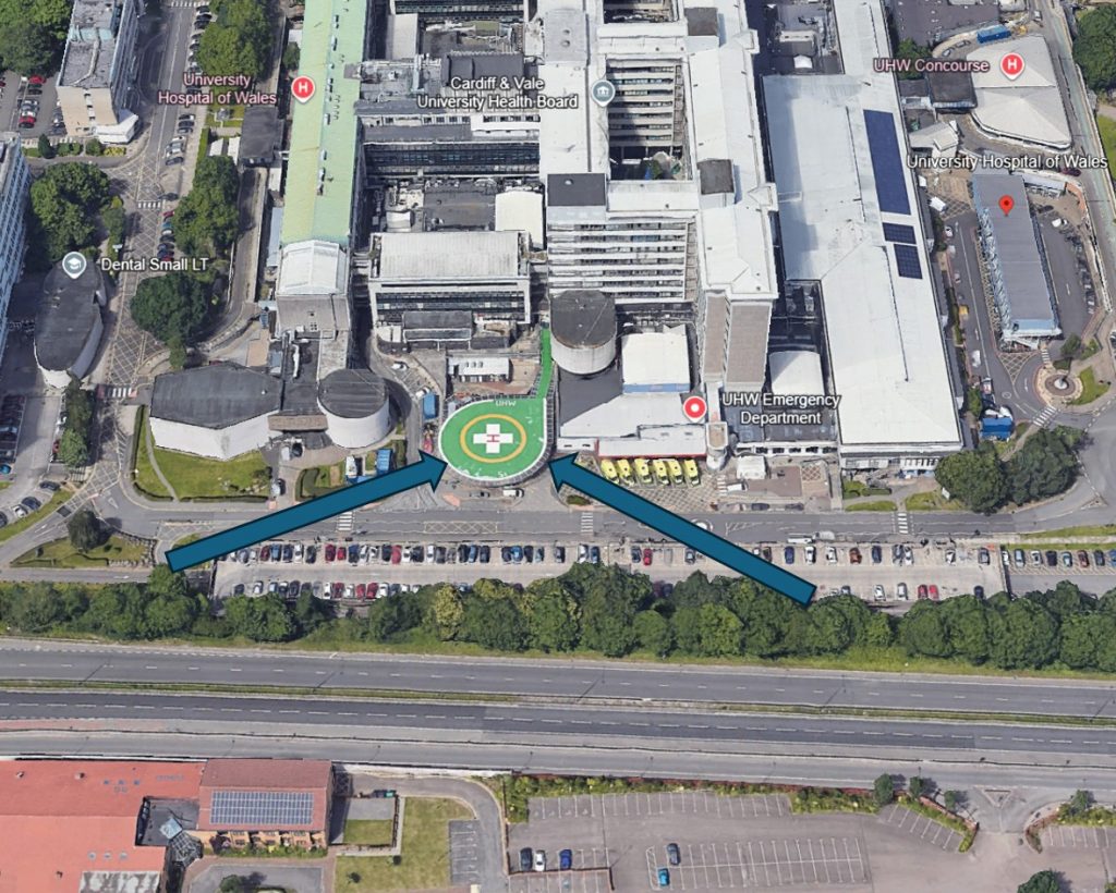As already mentioned, it may be possible at some sites to allow approaches from any direction if the site is open or elevated. However, it is likely that several defined paths have to be chosen. Ideally two approach paths split by 180 degrees should be chosen to cover every possible wind direction, but a minimum 135 degrees separation is recommended. Any separation less than 180 degrees increases the risk that an approach is impossible due to a downwind component (downwind approaches or departures are prohibited in Category A profiles). As an example, Cardiff Hospital’s pad has approach paths that are split by less than 180 degrees making approaches with a wind from due south impossible.