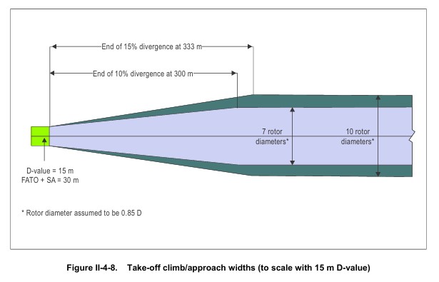 Having selected approach paths, the obstacles need to be assessed against those approach paths and a suitable buffer area around each option. The width of the FATO plus an increasing area with distance needs to be considered. The divergence is 10% by day and 15% by night. This continues until 7D or 10D respectively as shown below.