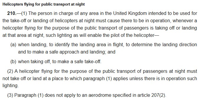 The adequacy of lighting for night operations to onshore helipads, is strangely poorly defined in the UK regulations. At the most basic level, the lighting requirement is simply described as needing to be “adequate”. However, CAP 3043 expands slightly on this by referring to the ANO at Article 210. This article refers to Public Transport operations which is actually only relevant to aircraft not subject to the Basic Regulation (eg state aircraft such as the Police and Coastguard). However, the CAA strongly recommend through the CAP, that all operators follow this guidance. The guidance is not very descriptive: