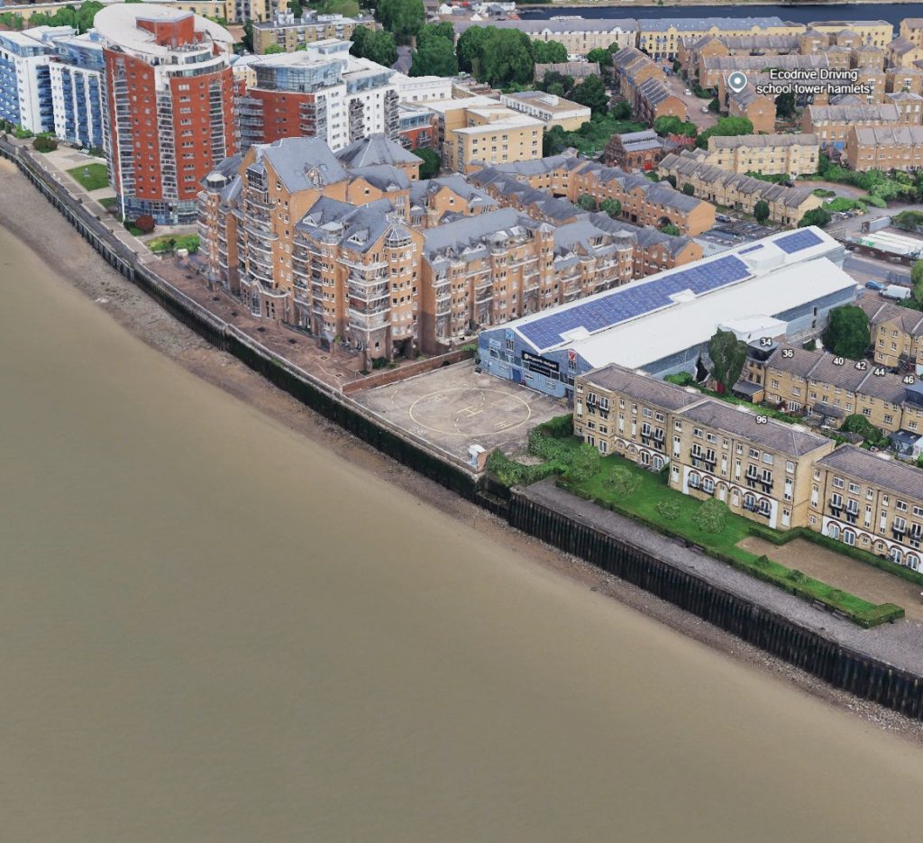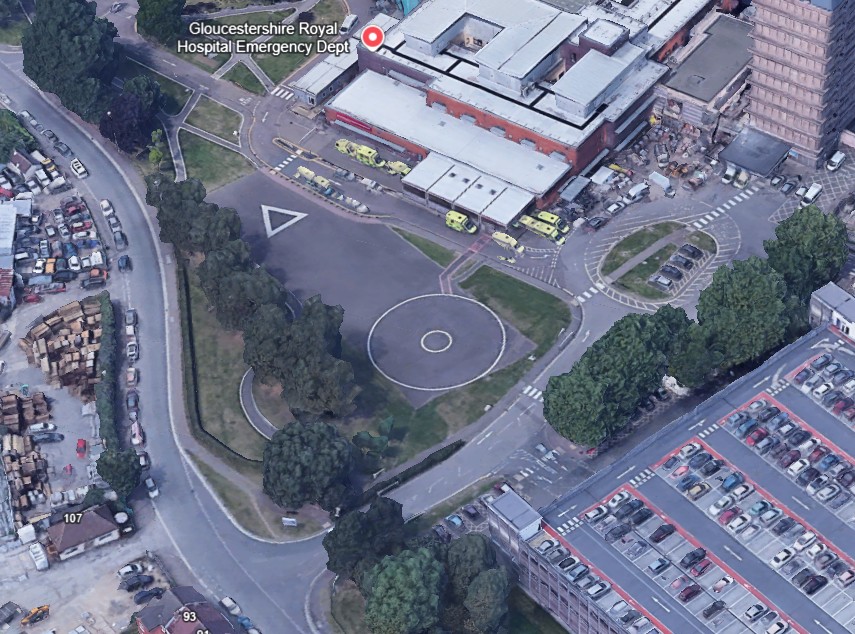However, at many landing sites, it’s reasonable to look at the obstacles that can be seen from around the landing site, as more distant obstacles can usually be avoided with small permitted turns. This may not be the case in terrain where rising ground or ridgelines need careful consideration. For example below, the car park behind the helicopter and the hospital building to the left definitely need consideration. The chimney being close to the landing site needs to be considered but it could probably be ignored if it were further out due to the possibility to turn.