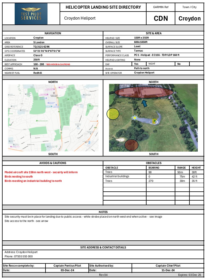 - Site suitability with reference to aircraft performance (eg which Cat A profile)