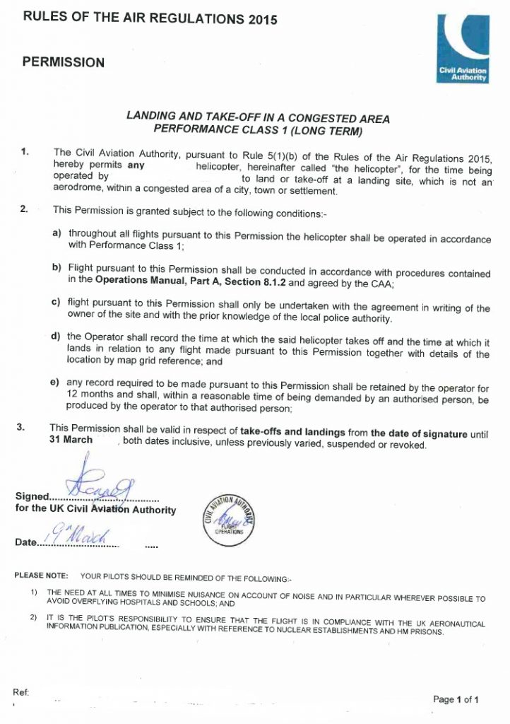 Using a landing site, other than an airfield, in a congested area requires specific permission from the CAA. This can be obtained on a case-by-case basis or through a long term permission. Procedures are in CAP 3043.