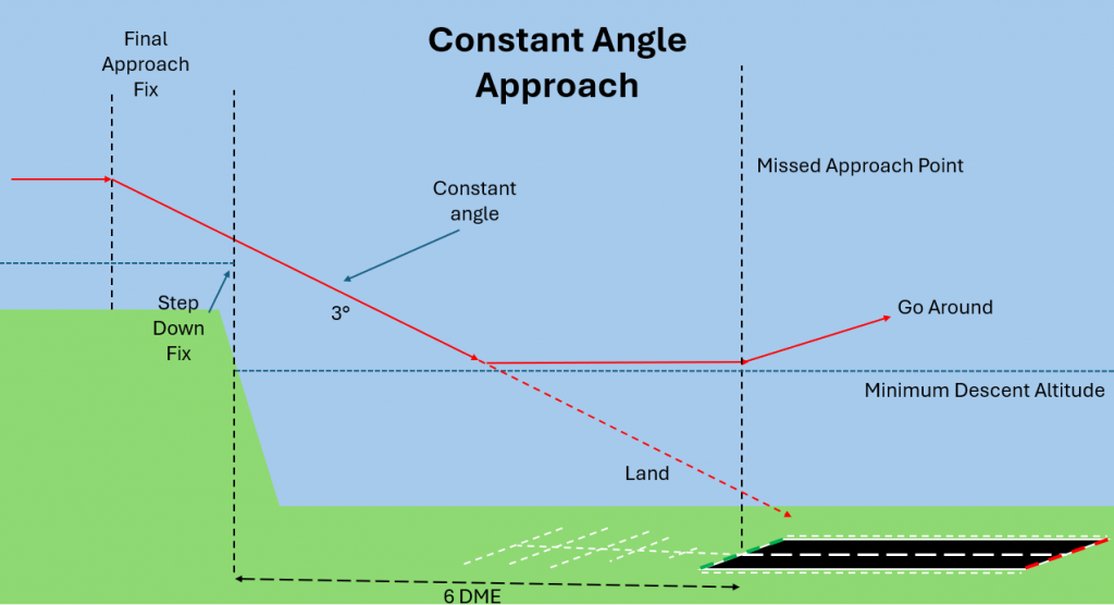 When the aircraft approaches MDA, a decision is made on whether to continue using the constant angle if visual references are available or to level off just above MDA. The aircraft continues just above MDA until either visual references are obtained or the aircraft reaches the Missed Approach Point where a go around is initiated.
