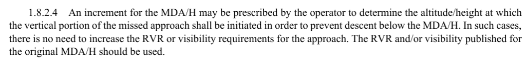 This is not without caveats. Each operator needs to ensure their crews are adequately trained in CDFA techniques to ensure height loss during the go-around is minimised – see GM5 CAT.OP.MPA.110. But of course this minimum height loss technique is normal for a 3D approach so the training burden is not high. But is it really now an obvious choice?