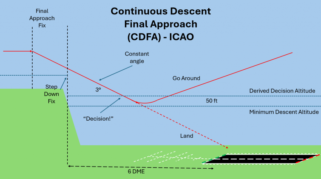 We do not need to reinvent the wheel. We simply need to borrow the “bottom” of a 3D approach operation. A constant descent profile concluding with a decision: either continue to land or immediately initiate a go-around. For CDFA the descent path can be flown using: