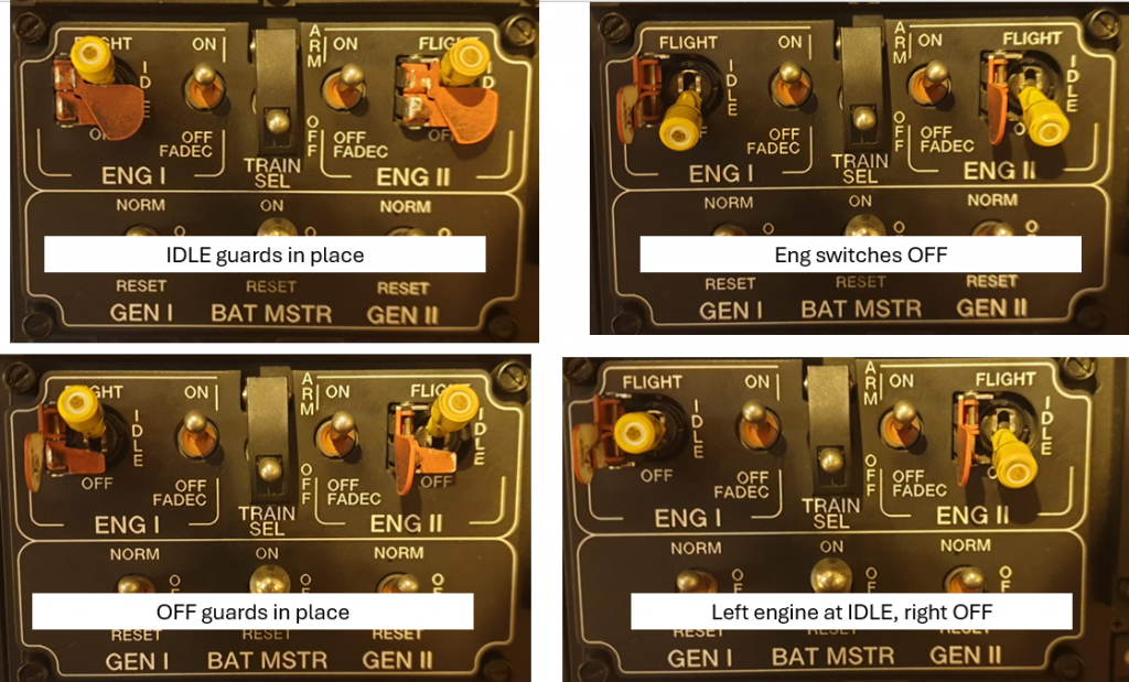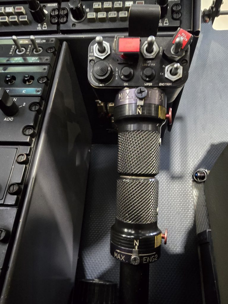 The engines are normally controlled by the pilot moving the yellow engine switches on a panel to the right of the CDS.