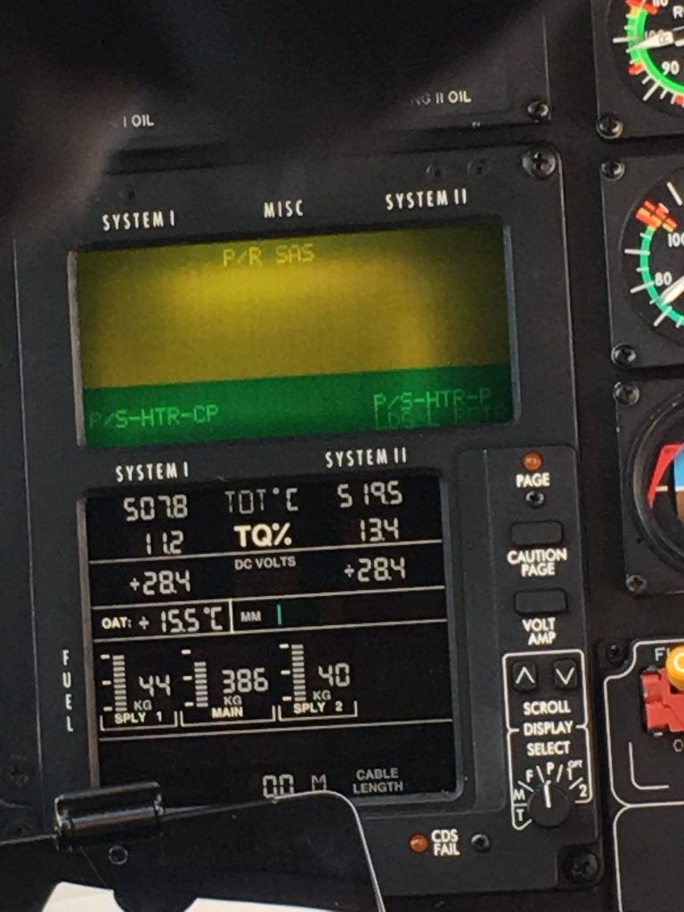 The CDS is an early version of the CPDS which might be more familiar to EC135 pilots. It has a caution display at the top and a digital LCD display of data at the bottom. If a caution illuminates on the caution display a caution button also illuminates but there is no audio (nor is there audio for cautions on EC135 CPDS).
