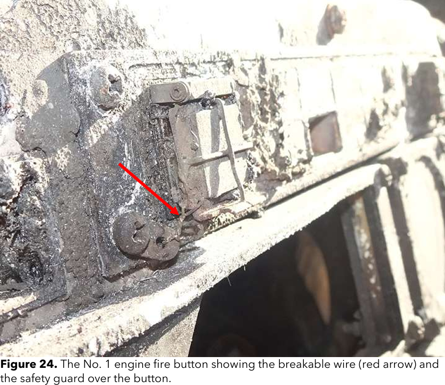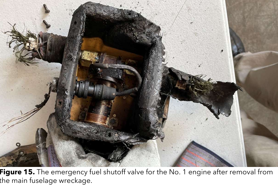 In the final report, the NTSB highlight that the EMER OFF switch was not pressed and the emergency fuel shut off was not closed. The pilot however stated on three occasions they pressed the button. In addition the pilot states they saw the green “ACTIVE” indication. On this point, the NTSB did some excellent technical analysis of the systems. As can be seen from the post accident wreckage inspection, the investigators did a deep technical analysis of the EMER OFF sw and shut off valve to determine their position (see the Airworthiness Group report). As can been seen from the images below, there was substantial fire damage to the fuselage and yet the investigators made a great job of technically analysing the components to determine their position.