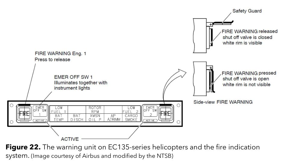 The pilot stated they saw the illuminated FIRE button and the associated “ding, ding…” audio. That is a clear indication of an engine compartment fire. Or is it? As the NTSB correctly highlight, it is an indication of a high temperature in the engine compartment. The pilot also stated in a later interview that simultaneously he saw a HTG OVTEMP caution. One of the sensors for this is between the 2 engine bays. Thus, it may have been very hot rather than a fire. Nevertheless, pilots are trained to react to such situations as a fire.