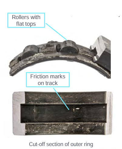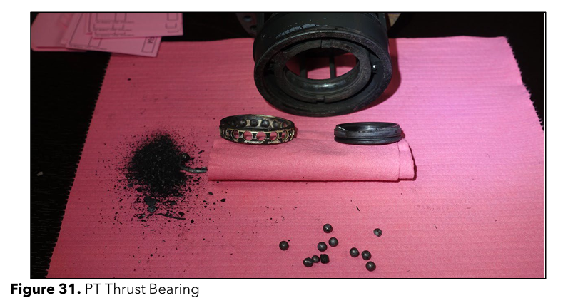 Despite the extensive technical investigation of the engine, the NTSB were unable to determine a cause for the engine to overheat. Essentially the whole root cause of the engine overheating and subsequent fire has not been determined. Whilst guessing as to a cause helps no one, one possible cause does not seem to have been considered. On several occasions, the NTSB assert there was no fire inside the engine compartment; instead the fire happened at the rear of the engine in the vicinity of air conditioning ducting made of fibreglass. However, the most rearwards bearing of the engine was found to be completely disintegrated (called the Power Turbine rear thrust bearing).