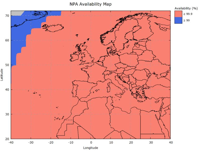 For the NPA service the accuracy require is not actually too stringent so this level of service can be provided relatively easily and actually quite far from a RIMS stations. Thus the service area for NPA is quite large. EGNOS provide maps of the service area for SoL in the EGNOS Service Definition Document (SDD). Note the UK is within this service area without any gaps: